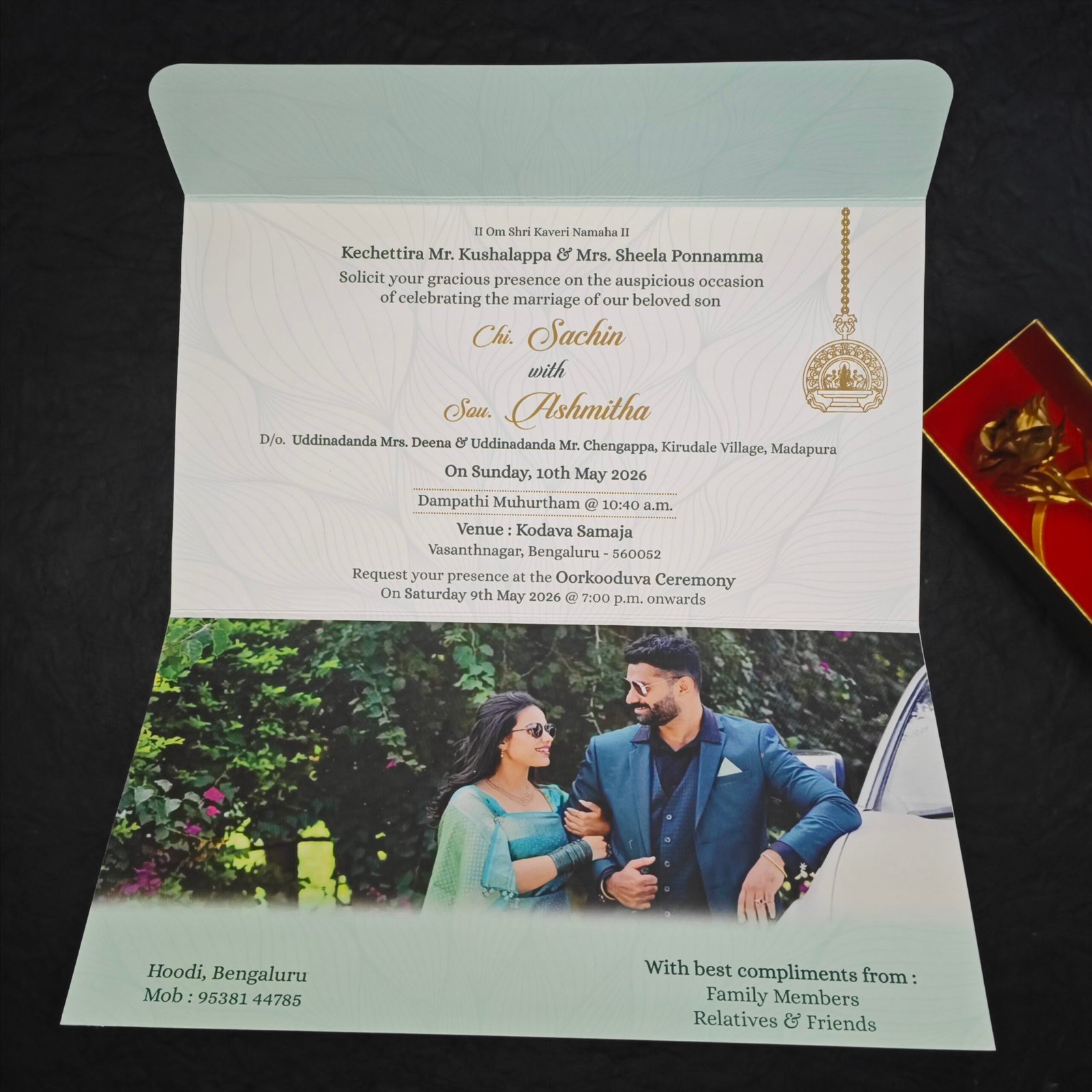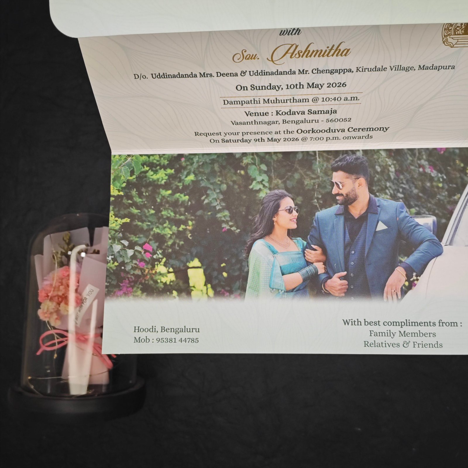 Inside, the layout is beautifully structured with detailed wedding information and a dedicated printed couple photo panel, making it both an invitation and a memorable keepsake.