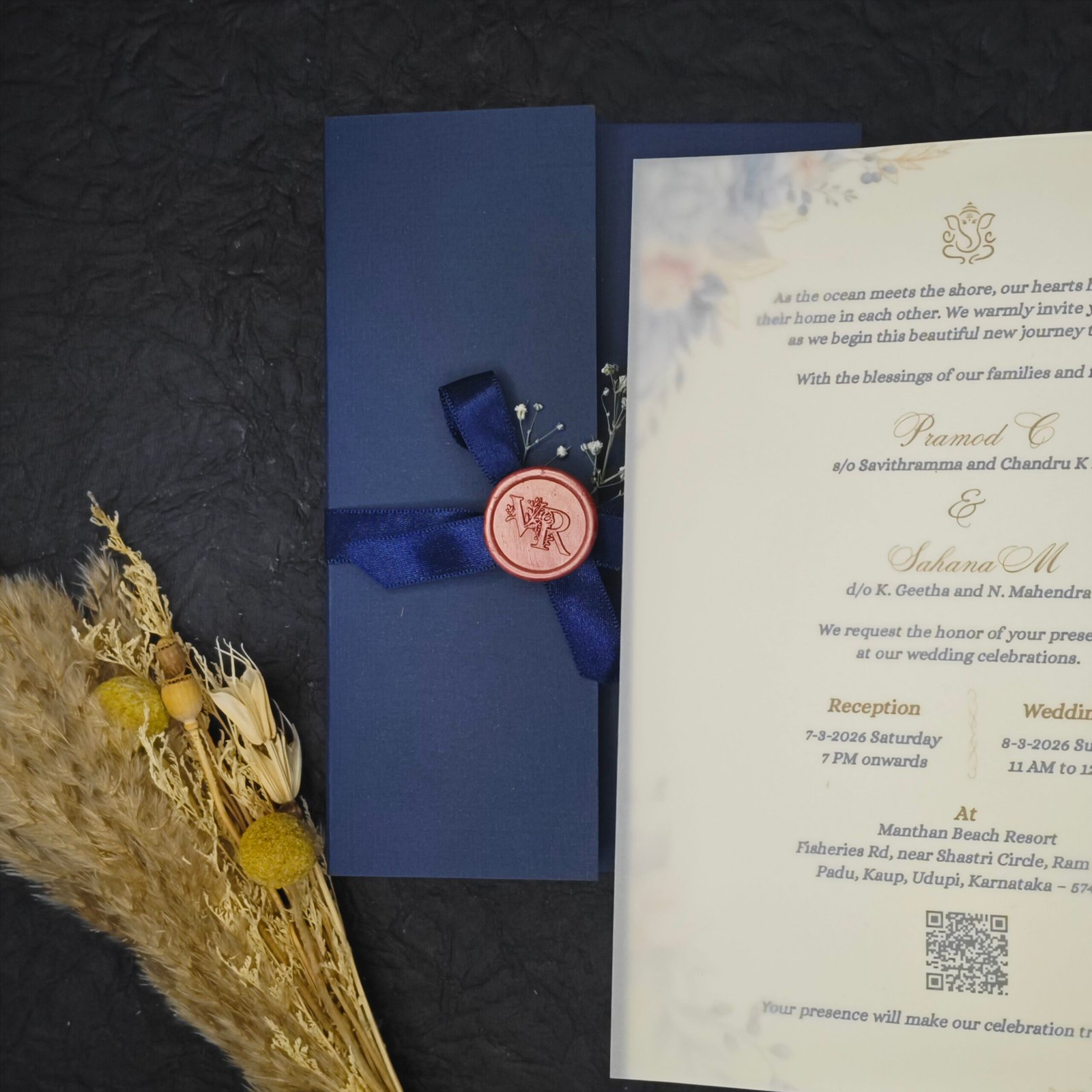 This invitation set features a beautifully printed floral main card layered beneath a soft frosted vellum sheet. The ensemble is wrapped in a premium navy blue textured sleeve and secured with a satin ribbon and customized wax seal monogram.