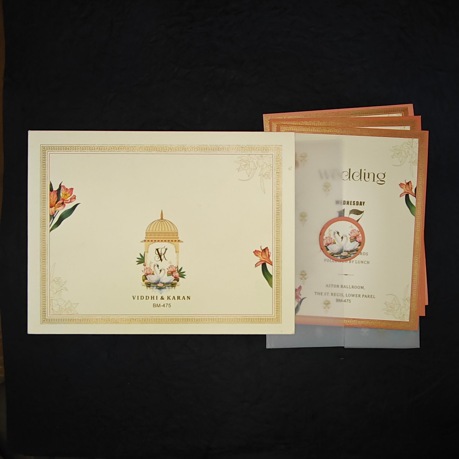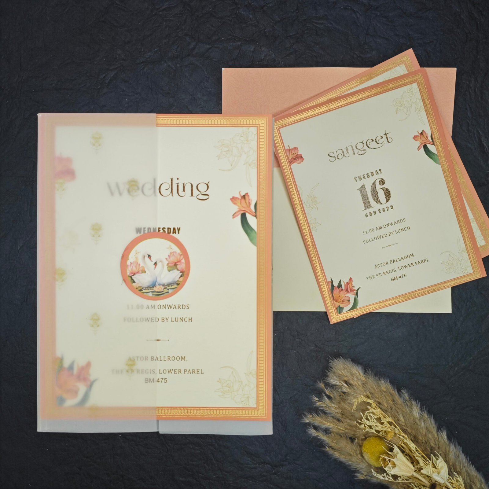 Designed in soft peach tones with intricate gold border detailing, this invitation set features a translucent vellum outer wrap that creates a beautiful layered reveal effect. The inner cards are adorned with delicate floral illustrations and a swan motif symbolizing purity and lifelong companionship.