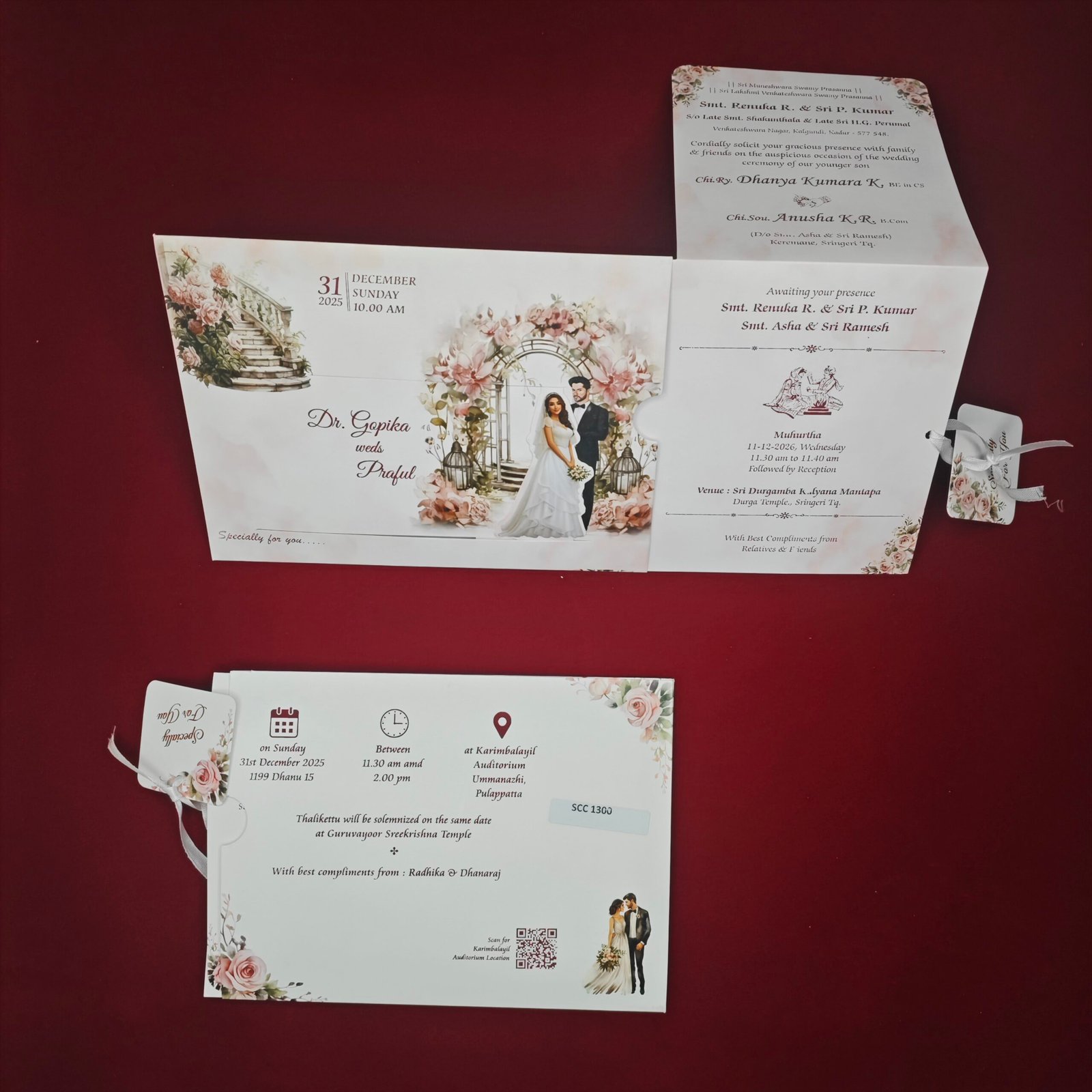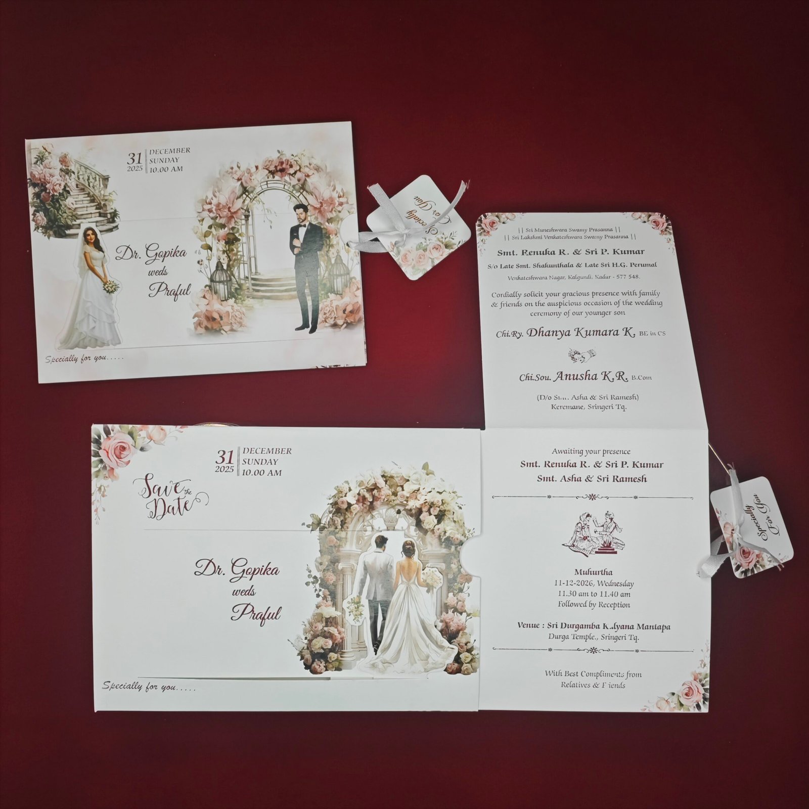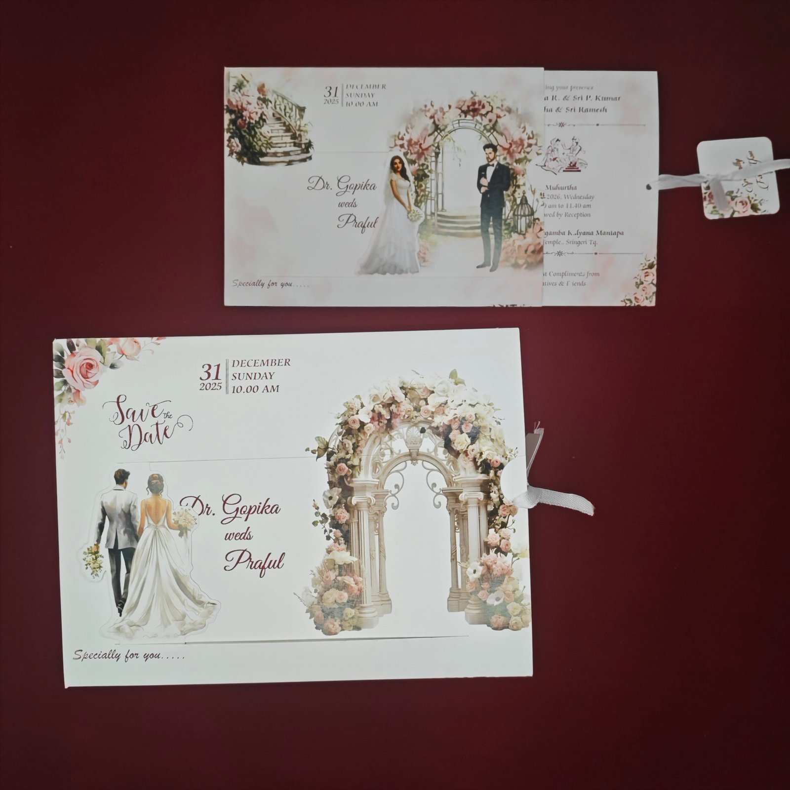 The design is presented in a modern horizontal format with a sliding insert and ribbon detail, allowing wedding information to be displayed in a neat and elegant way. With soft pastel tones and detailed floral elements, this invitation is perfect for couples who want a customized and visually meaningful wedding card that reflects their story.