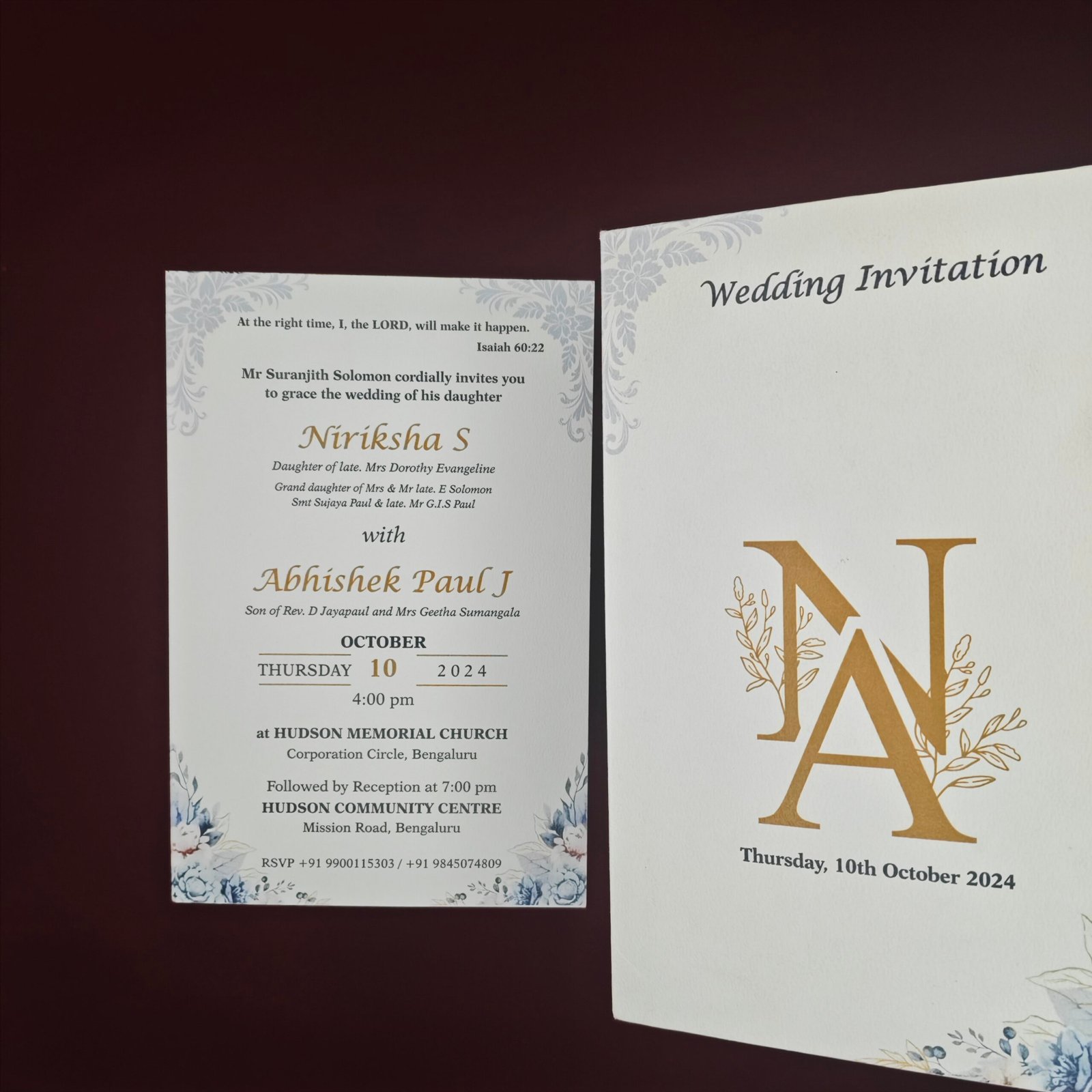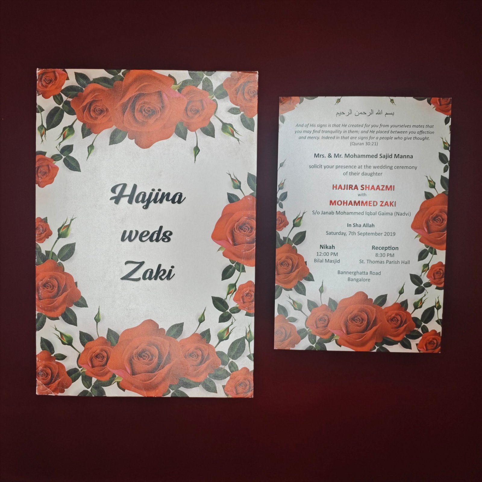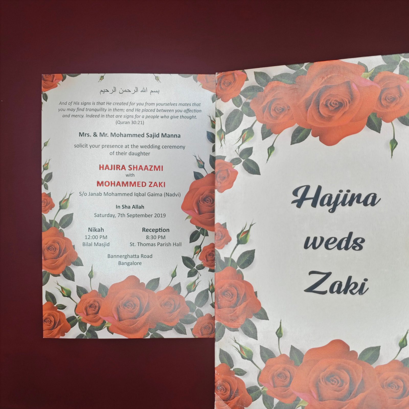 The design highlights the couple’s names at the center, framed by lush rose illustrations that symbolize love, passion, and celebration. The inner invitation card complements the floral theme while presenting the event details in a clear and organized format.