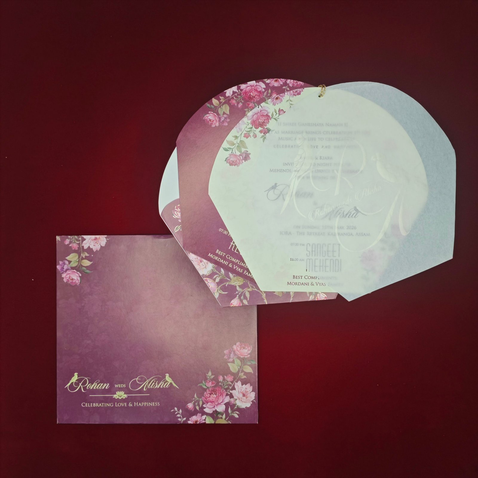The invitation includes multiple insert cards that are carefully designed to match the overall floral theme. These inserts provide space for different wedding events, schedules, and venue details, ensuring that all information is presented clearly and beautifully.