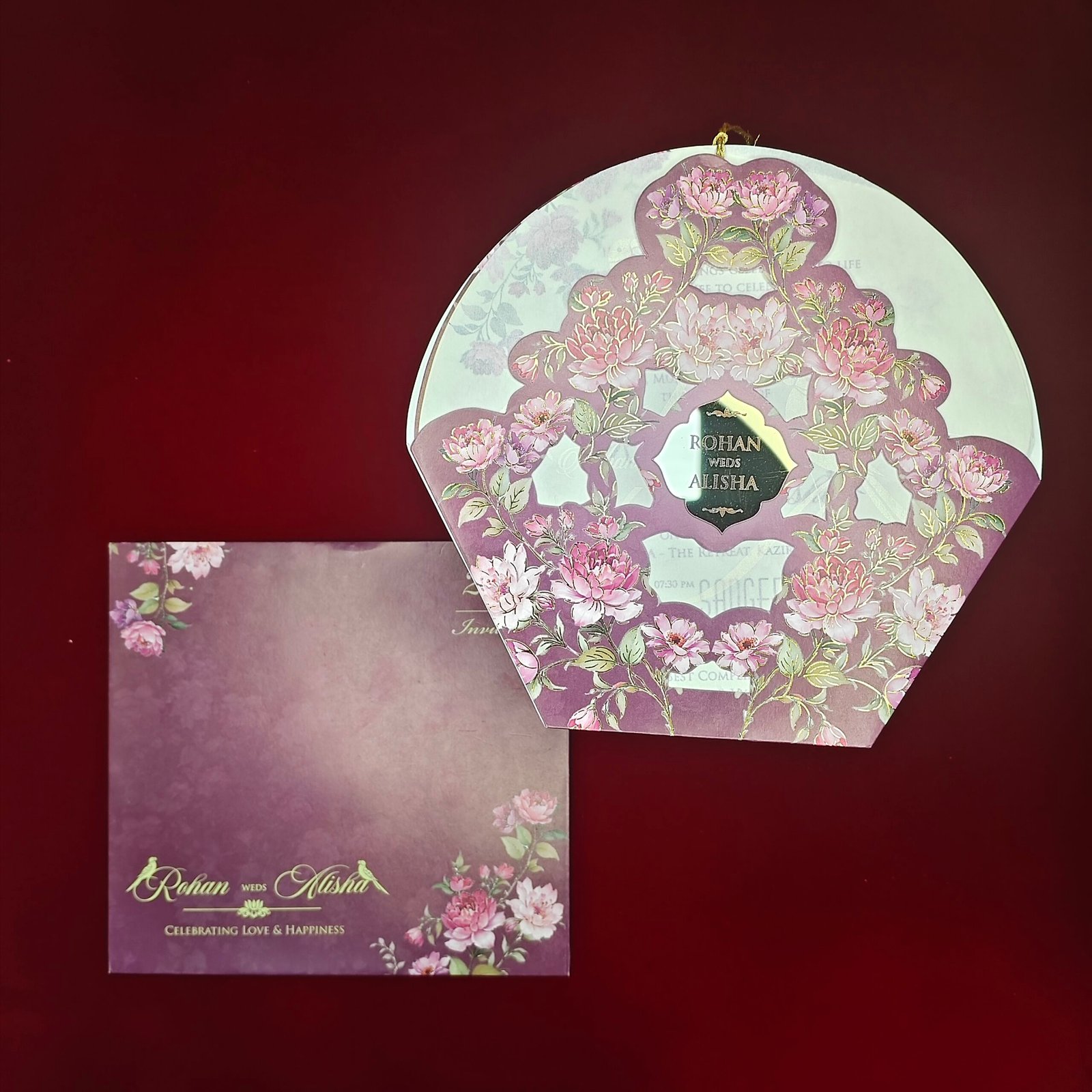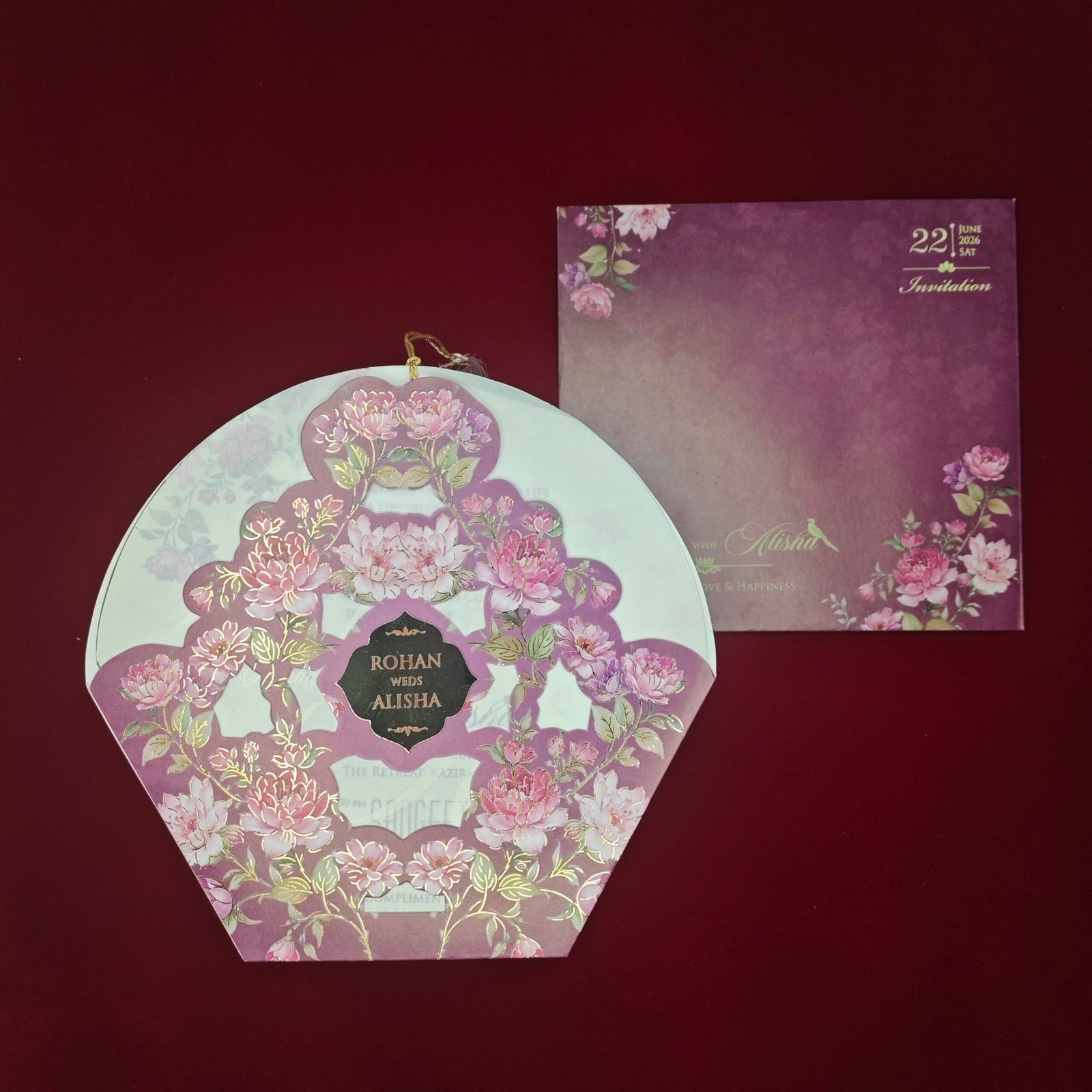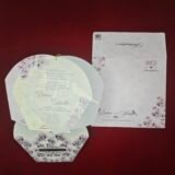 This invitation is crafted with a soft pastel palette that creates a soothing and elegant visual appeal. The outer layer features an intricately designed floral cutwork pattern in blush and mauve tones, forming a decorative frame that instantly enhances the premium feel of the invitation.