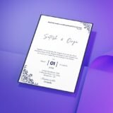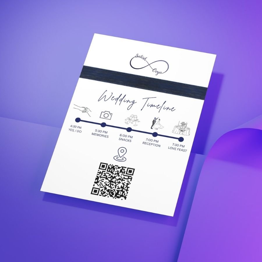 The inside layout is thoughtfully designed with a clear event structure, including a unique wedding timeline and QR code integration for location sharing. The minimal floral accents and refined typography make it ideal for contemporary wedding celebrations while maintaining a classic touch.