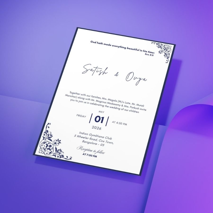 This beautifully crafted wedding invitation card blends simplicity with sophistication. The crisp white base paired with a deep navy ribbon detail creates a graceful and modern presentation, perfect for couples looking for a neat and elegant invite.