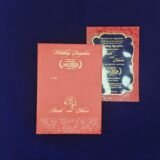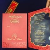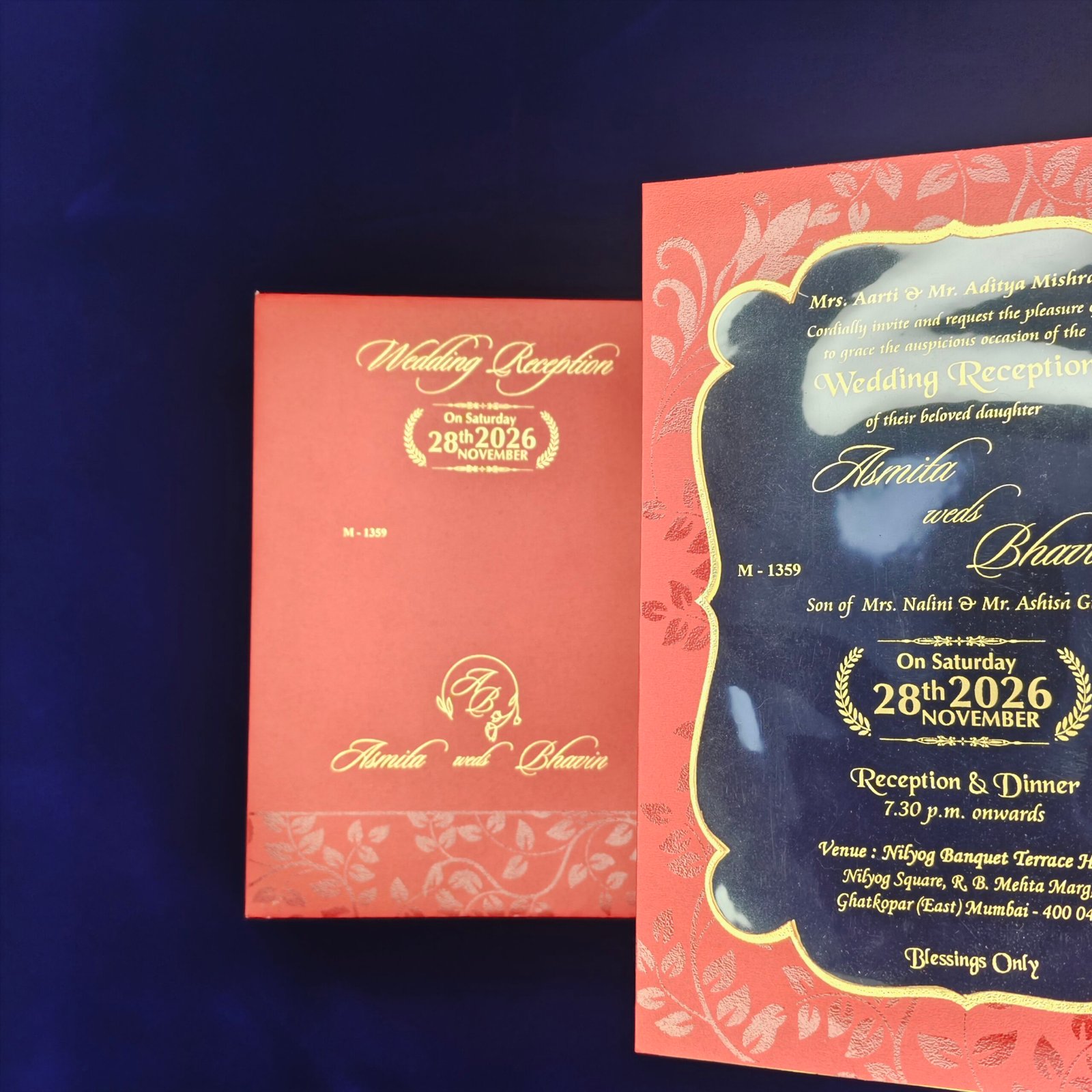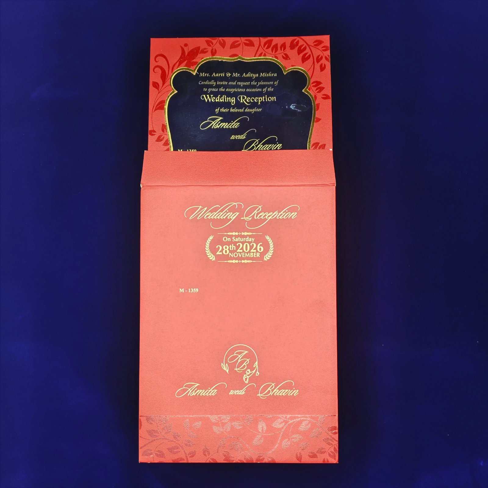 Inside the pocket, a beautifully designed insert card slides out smoothly, revealing the full wedding reception details in a decorative gold-bordered layout. The contrast between the deep red outer cover and the black invitation panel with gold lettering creates a luxurious and eye-catching design.
