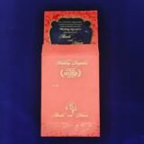 A stylish royal red pocket-style wedding invitation featuring elegant gold foil printing and a sliding insert card. The design includes a decorative frame layout with premium textured paper, perfect for modern and traditional wedding receptions.
