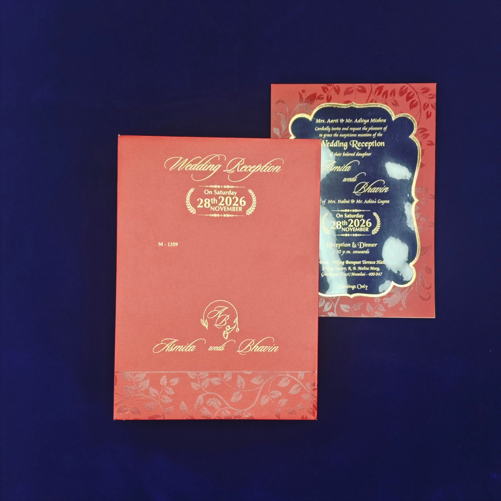 This invitation features a premium red pocket-style holder with elegant gold foil typography and decorative floral patterns. The pocket cover displays the reception date and couple initials, giving the invitation a sophisticated first impression.